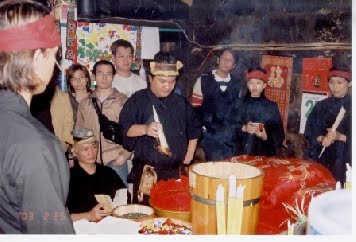 先燃點紅燭,叩拜三次,然後插在香爐上。接著燃點檀香三枝,也叩拜三次,插香爐上。