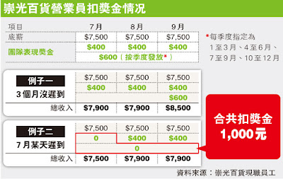 另外,本報從現職員工處,亦聽到類似的扣獎金,本報於分店現場採訪,大 部分員工就此事支吾以對,稱公司要求「封口」。崇光發言人昨證實,公司設「團隊表現獎」,若同事每月沒有遲到或其他出缺紀錄,即可獲此獎勵。 按機制,獎金 每月400元,連續3個月無遲到紀錄,可另外獲發400至600元。另外,若員工於該月累積遲到超過30分鐘,需再扣減底薪,制度適用於全線 800名直屬 員工。發言人稱,員工如有需要,可申請豁免遲到,公司會個別審核,公司於2009年颱風「巨爵」襲港時,曾豁免共3名居於屯門及長洲的員工遲 到。