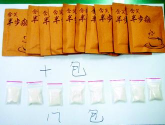 警方表示,“含笑半步癲”是將K粉及搖頭丸混合研磨成粉末,再摻入沖泡咖啡粉,製成速溶包,加入水、飲料、酒類服用後,含 笑半步癲使用者先會變得很high,接着出現幻想、幻聽,之後會變得癱軟無力。