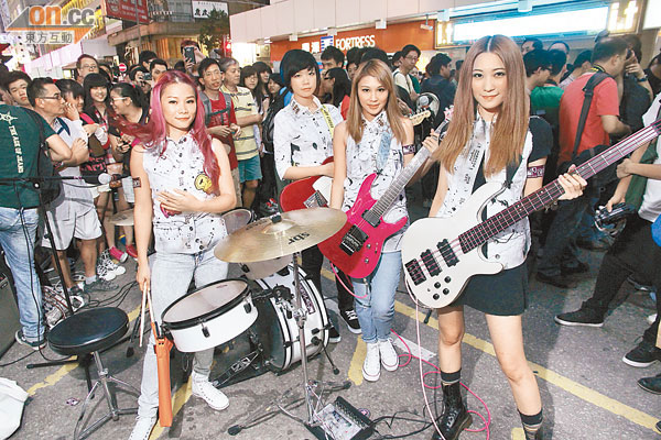 四人女子樂隊Choco成員Nova、Cathy、Mel、和Kiki鬼主意多多,繼早前到尖沙咀快閃宣傳後,昨天她們轉移陣地到旺角行人 專用區,帶齊結他和鼓等「架生」現場表演四首歌,吸引半百途人圍觀,擠得水洩不通!