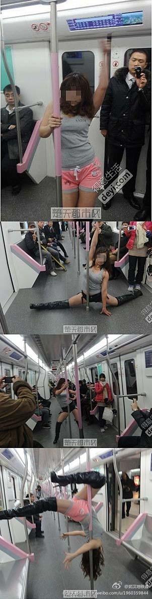 在大陸網路上出現了幾個穿著火熱的妙齡少女在地鐵上跳鋼管舞的影片,武漢地鐵集團相關負責人表示,「這種做法擾亂了交通秩序,不值得提 倡」。