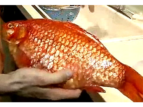 不一會兒,邁克手中釣竿開始扯動,當他努力把釣勾拉出水面後,竟在釣勾上看到一隻巨大無比的金魚,令他嚇得目瞪口呆,不該如何是好。經過測 量,這隻巨無霸金魚重達1.5公斤,身長約38公分,堪稱金魚之王。