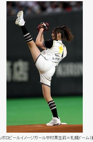 3月22日這位靚妹首度為日本火腿隊開球,當時一字馬開球的動作開啟模仿風潮,南韓女星 宋茜、人氣團體少女時代徐玄都曾大腳頂天投出驚為天人的一球。 6月12日這天,中村果生莉再度來到札幌巨蛋,投球之前和一般來賓相同,先向觀眾、球員及裁判行禮。
