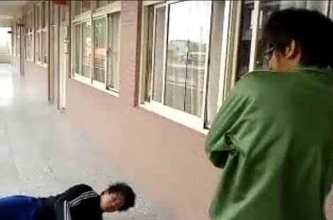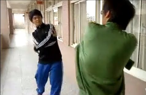 在批踢踢「笨版」發現的這個影片中,兩名男同學架式十足,準備舞力全開,只是沒想到,其中一名同學耍狠喊出「yo!battle」後,就使出「必殺技」,讓綠衣的挑戰者擺著相同POSE往下看,圍觀的同學也傻眼,誰也沒想到有這一招。