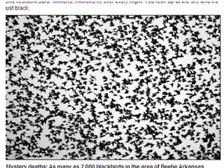 美國阿肯色州自上週開始,西北部的阿肯色河(Arkansas River)陸續發現有10萬條石首魚(Drum fish)死亡,接著在除夕夜有大批黑鳥從天上掉下來墜地死亡(阿肯色鳥雨),一連串自然異象驚動當局,官員正在調查造成阿肯色河魚群死亡的原因;此外,畢比鎮官員說,數以千隻山鳥(阿肯色鳥雨)可能是受驚而死。