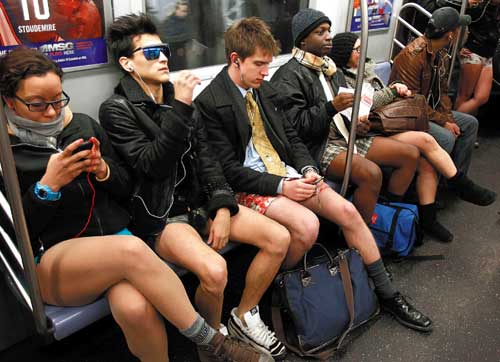 Subway Ride)活動中,數以百計拉著吊環站立紐約脫褲日的紐約客,儘管上半身穿當季的夾克、圍巾和其他冬季服裝,卻脫去了腰部以下的褲子裙子。