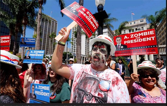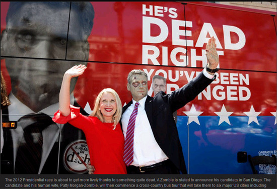 一名“殭屍”近日宣稱將競選美國總統。盡管他不是真的殭屍,但他到處以“殭屍”的名義拉選票。這位“殭屍”候選人已經在聖迭戈獲得候選人資 格,他與人類妻子帕蒂·摩根-殭屍(Patty Morgan-Zombie)將開始全國公共汽車之旅
